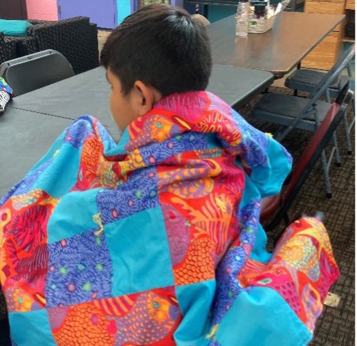 Which quilt will a child choose? It’s sometimes a surprise but always a delight to see. Often, we receive photos of children with their quilts. Unfortunately, we cannot share photos that identify specific children. We must keep them off the internet. Many of the migrants are trying to escape gangs, traffickers, drug cartels, etc. Facial recognition software makes it easy for these nasty characters to track down people. We respect the necessity for this pictorial silence. Occasionally, however, photos come to us that can be shared because neither the face nor any other identifying characteristics are shown. Here’s one of our favorites, sent to us by Susan Rogers when she delivered two large duffel bags filled with quilts to a shelter.