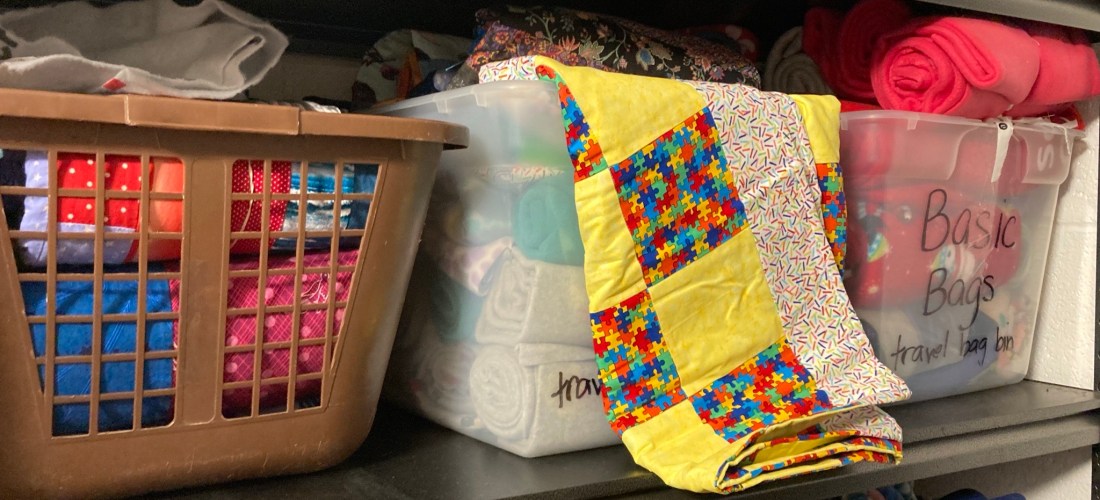 After an asylum seeker’s initial processing at Casa Alitas, a shelter in Tucson, Arizona, the next step is arranging transportation to their destination. This travel may be by bus, train or plane. Every traveler and family is given a backpack or bag with essentials, dependent upon the size of the family and needs of the traveler. Our quilts are a mainstay and keep the travelers warm and comfortable. This photo shows the prep area for travel bags, which also may include snack items, toys, personal hygiene items and baby food. ~ Susan Rogers, First Crew, Portland, Oregon.