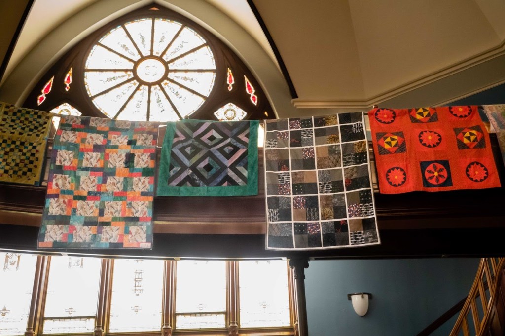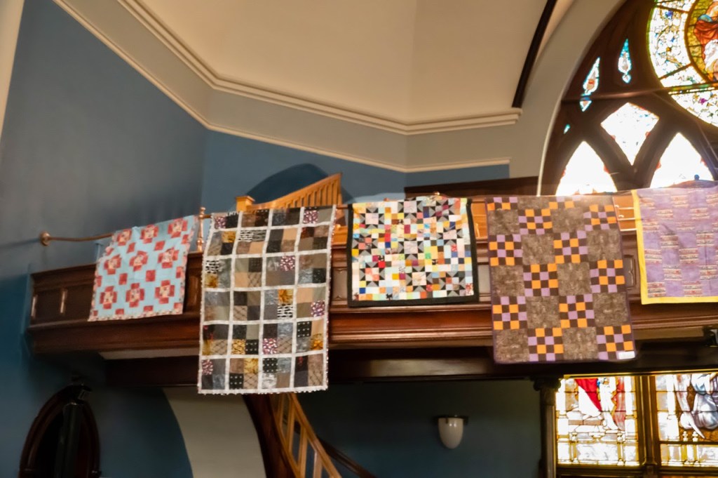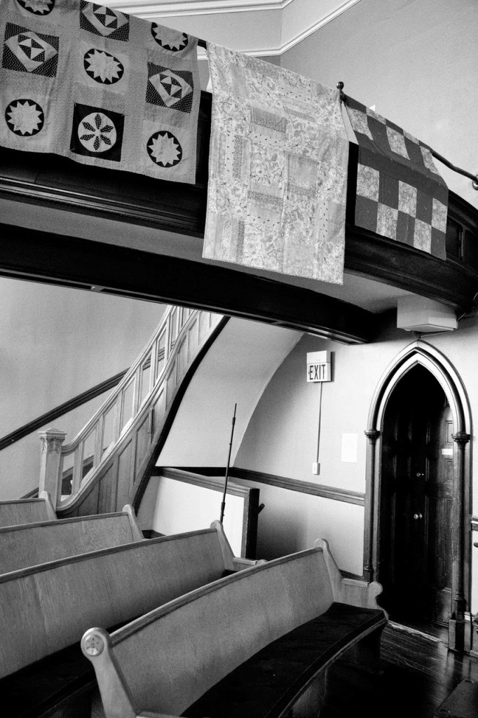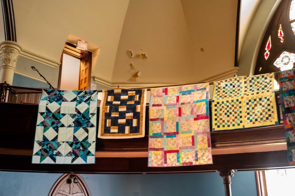 In honor of our second anniversary, Pat Fitzgerald, friend of Bienvenidos Quilts, photographed our quilts hanging in the historic First Congregational UCC sanctuary in Portland. The quilts will be on display in the sanctuary while they await distribution to organizations at the border – usually in groups of 40 or 50. ~ Rachel Stevens, First Crew, Portland, Oregon