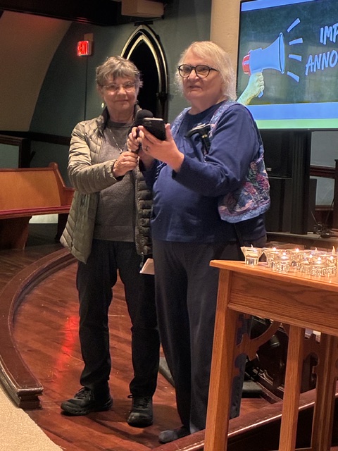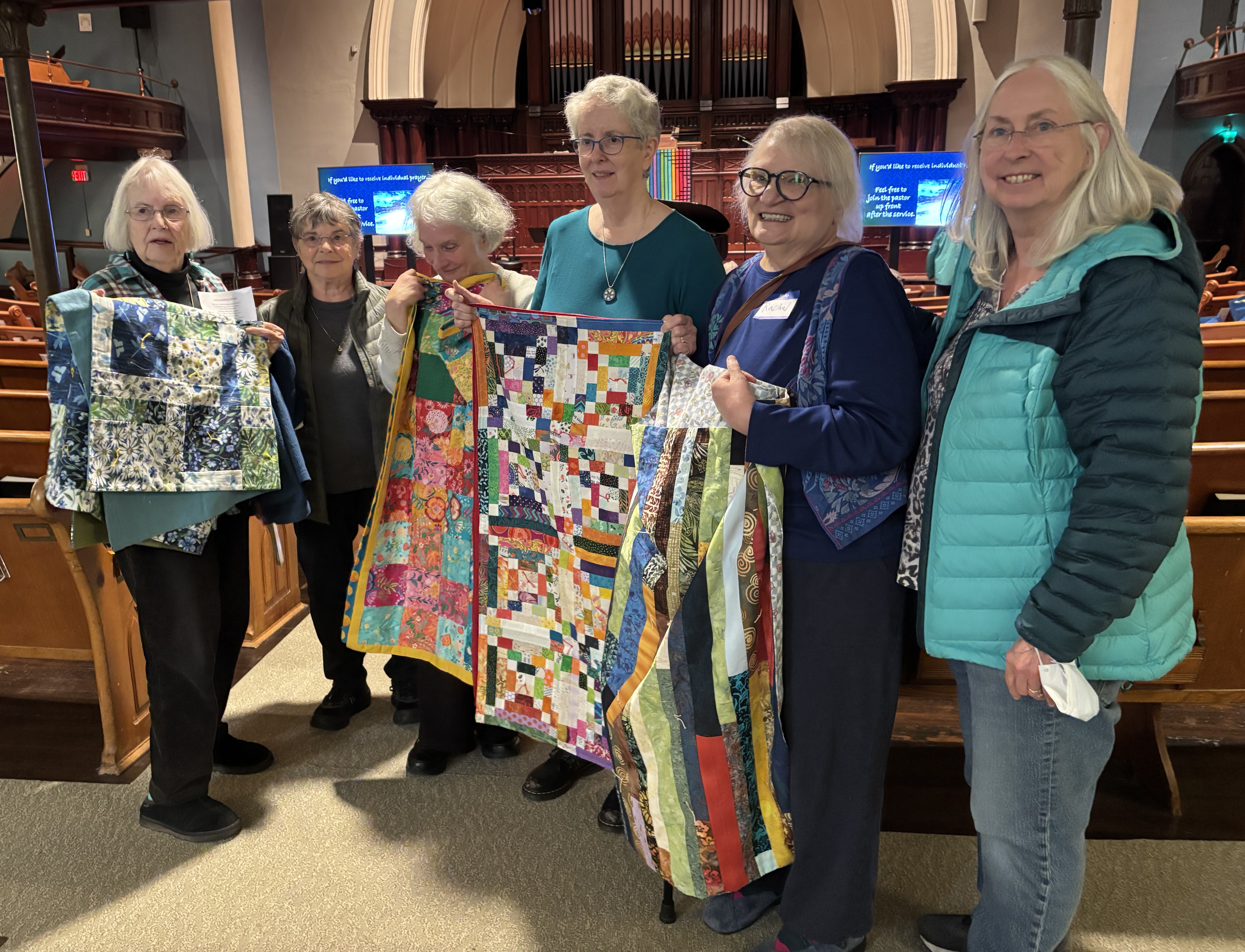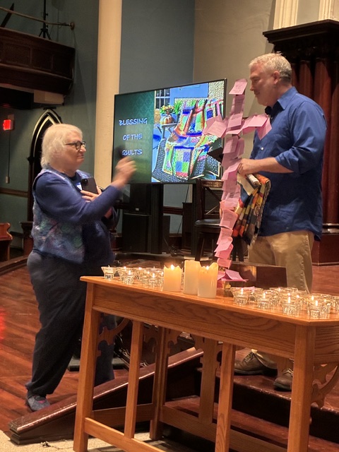 First Crew quilters brought about 40 quilts to the FCUCC sanctuary for blessing before the quilts would be donated to the Rose Haven Day Shelter and Community Center for women, children and families who receive its important services. Rose Haven volunteer Nancy Kurkinen (L) and Bienvenidos Quilts founder Rachel Stevens (R) gave short talks before Pastor Derek Austin blessed the quilts. Quilters in attendance gathered afterwards. After delivering the quilts, Susan Adcock emailed, “I had a wonderful experience this afternoon taking quilts to Rose Haven. I was greeted by staff members [who] had heard all about the quilt blessing from Nancy, who came on Sunday. They think people will be delighted by these quilts!”